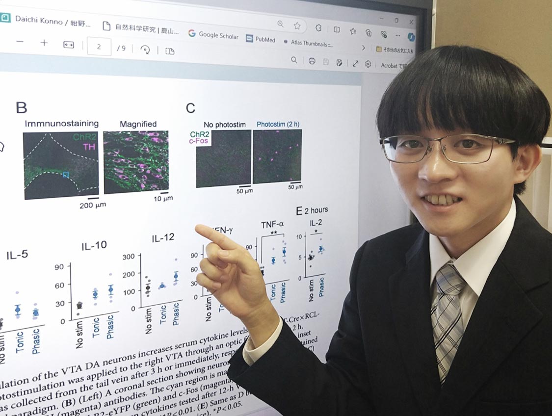 近年、末梢臓器の炎症が、うつ病などの精神疾患を引き起こす原因のひとつである、という説が報告され始めています。こうした背景から、私は、末梢臓器の炎症が脳活動に与える影響について研究しています。この研究を進めることで、精神疾患の治療薬開発の一助となるような研究成果を出したいと考えています。また、学生に教えることも好きなので、大学の先生になることも目標のひとつです。