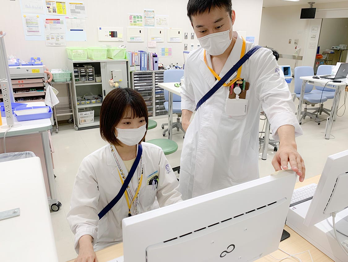 ICUでは午前中に回診があり薬剤師も同行します。回診には医師、看護師のほか、臨床工学技士(人工呼吸器などの医療機器の操作及び保守点検を行うスタッフ)や管理栄養士がおり、多職種で情報を共有し患者さんの治療について意見を交わします。このような場で、ディスカッション能力の重要性を痛感します。より良い治療に貢献するためには、他職種の見解をなるべく適切に把握し、教科書的ではなく臨床に即した意見を簡潔に伝えなければなりません。大学時代にはありませんでしたが、カンファレンスを模した授業や、医学部や看護学部の学生との討論を経験しておけば、他職種の立場をより把握し、実を伴った意見を述べる力を培うことができたのではないかと思います。薬剤師を目指す方は、積極的に医学部や看護学部、その他医療系学部の学生と広く交流を持ち、学生のうちから他職種の職能を理解しておくことは大事だと思います。