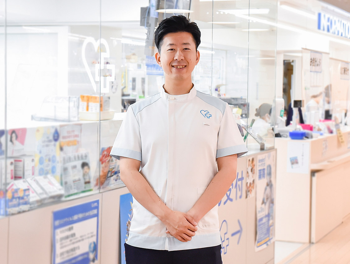 福岡県を中心に調剤薬局やドラッグストアを展開している大賀薬局の「大賀薬局天神ビル店」で薬局長として勤務しています。2022年10月からは近隣の店舗の薬局長を束ねるブロック長も兼任しています。